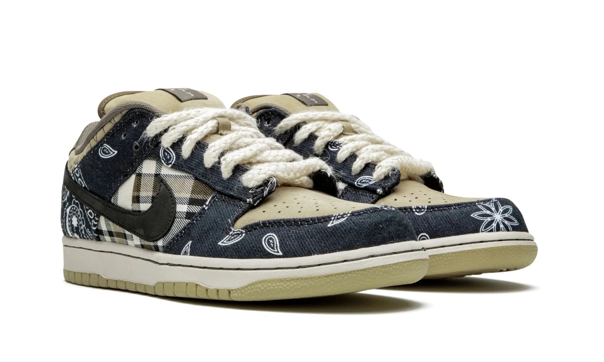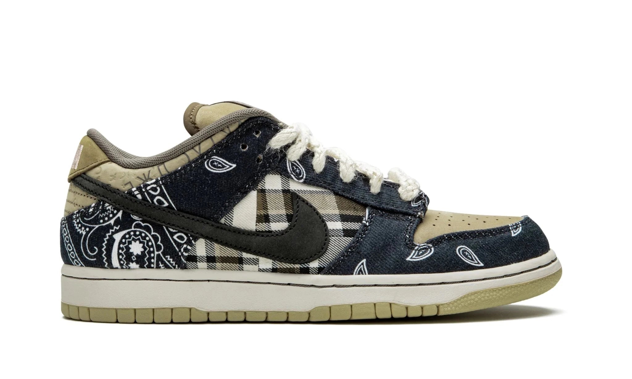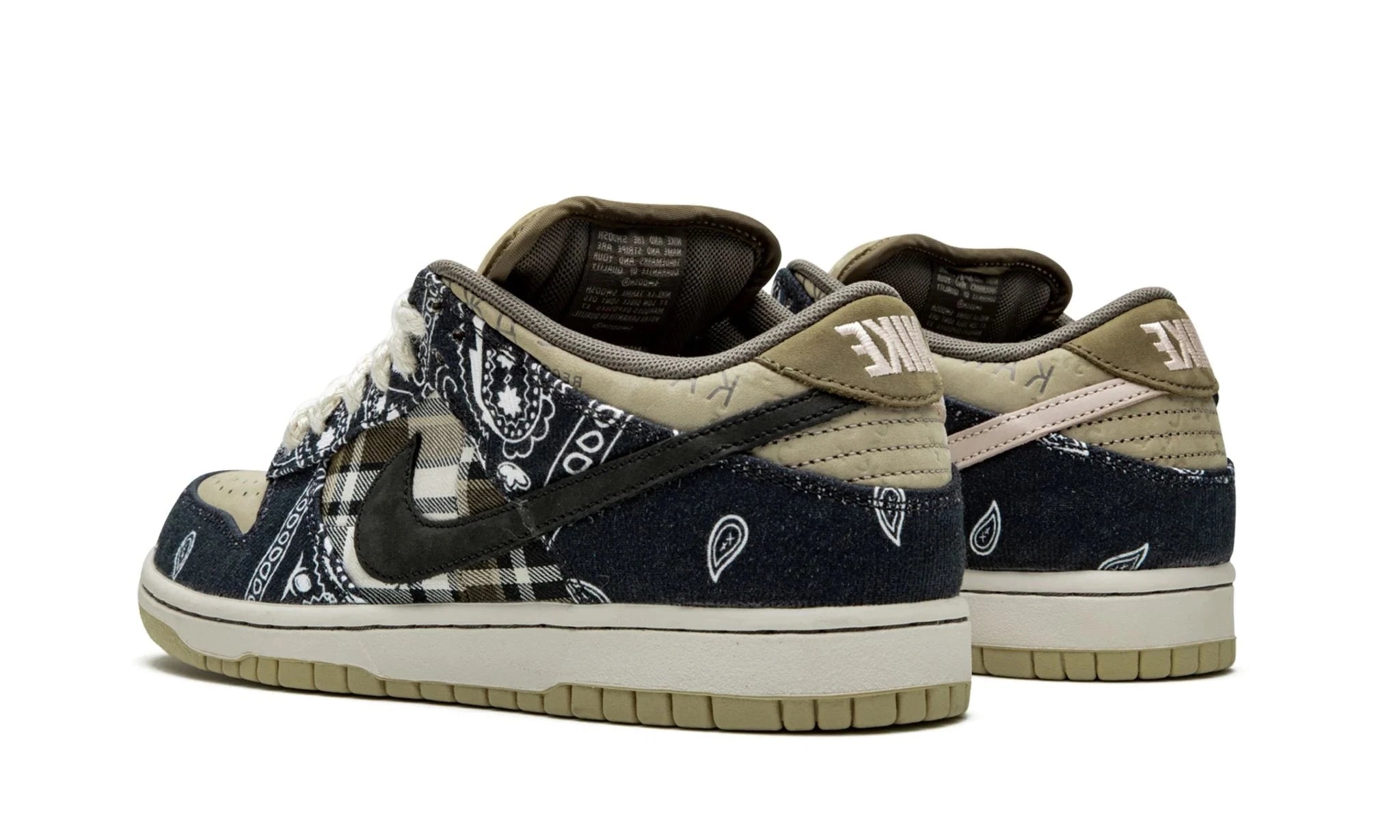 - Eclectic Colorway: The "Travis Scott" edition of the SB Dunk Low features an earthy, rugged color palette with a mix of brown, black, tan, and navy hues. These tones are complemented by various patterns and textures, including paisley bandana prints and plaid flannel overlays, reflecting Travis Scott's eclectic and street-inspired aesthetic.