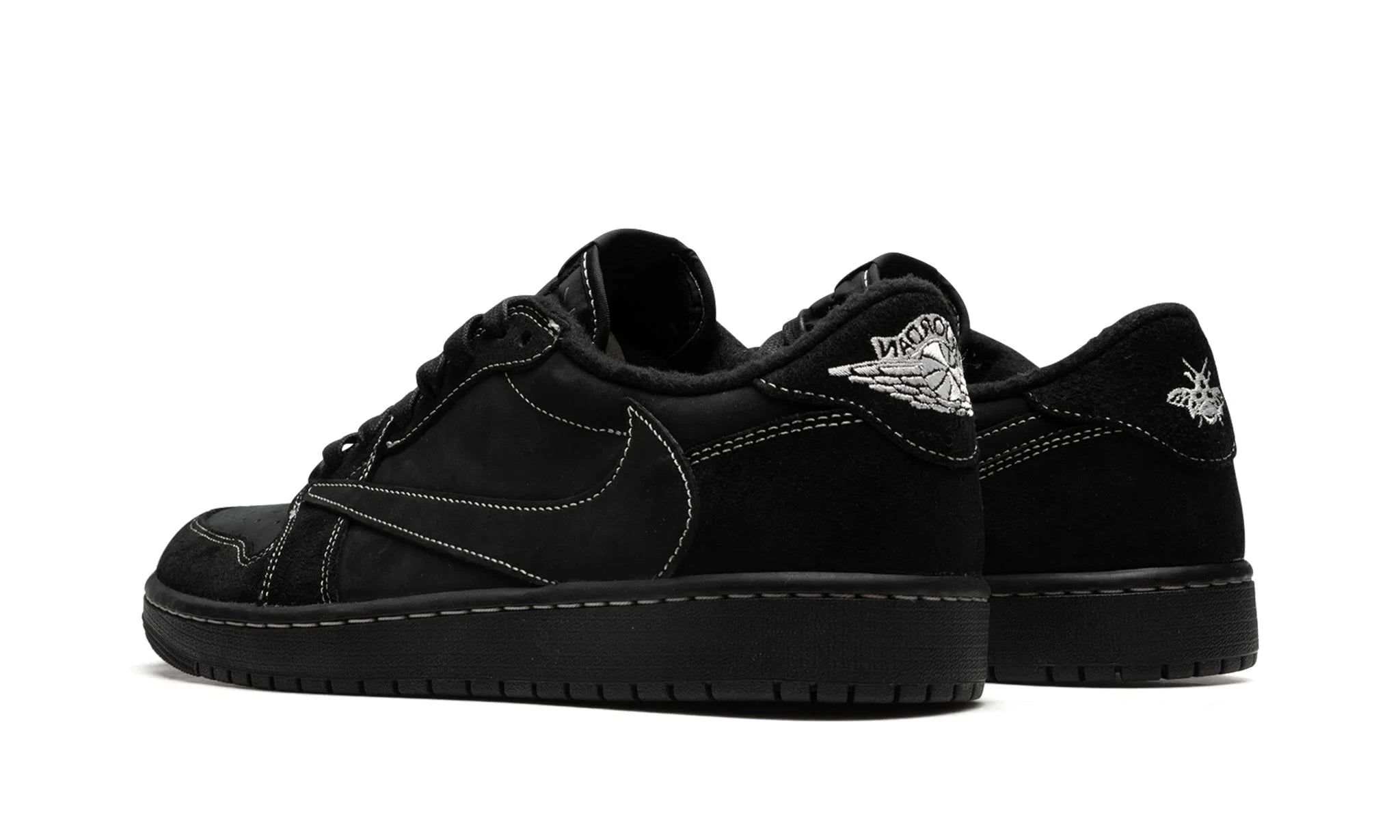 Key details include white contrast stitching throughout the upper, which adds texture and depth to the otherwise all-black design. The heel of the shoe features a bee motif, symbolizing Scott's daughter Stormi and adding a personal touch to the collaboration. Additionally, the Cactus Jack branding is subtly placed on the tongue, medial side, and insole, maintaining the signature elements that fans have come to expect from Travis Scott's designs.