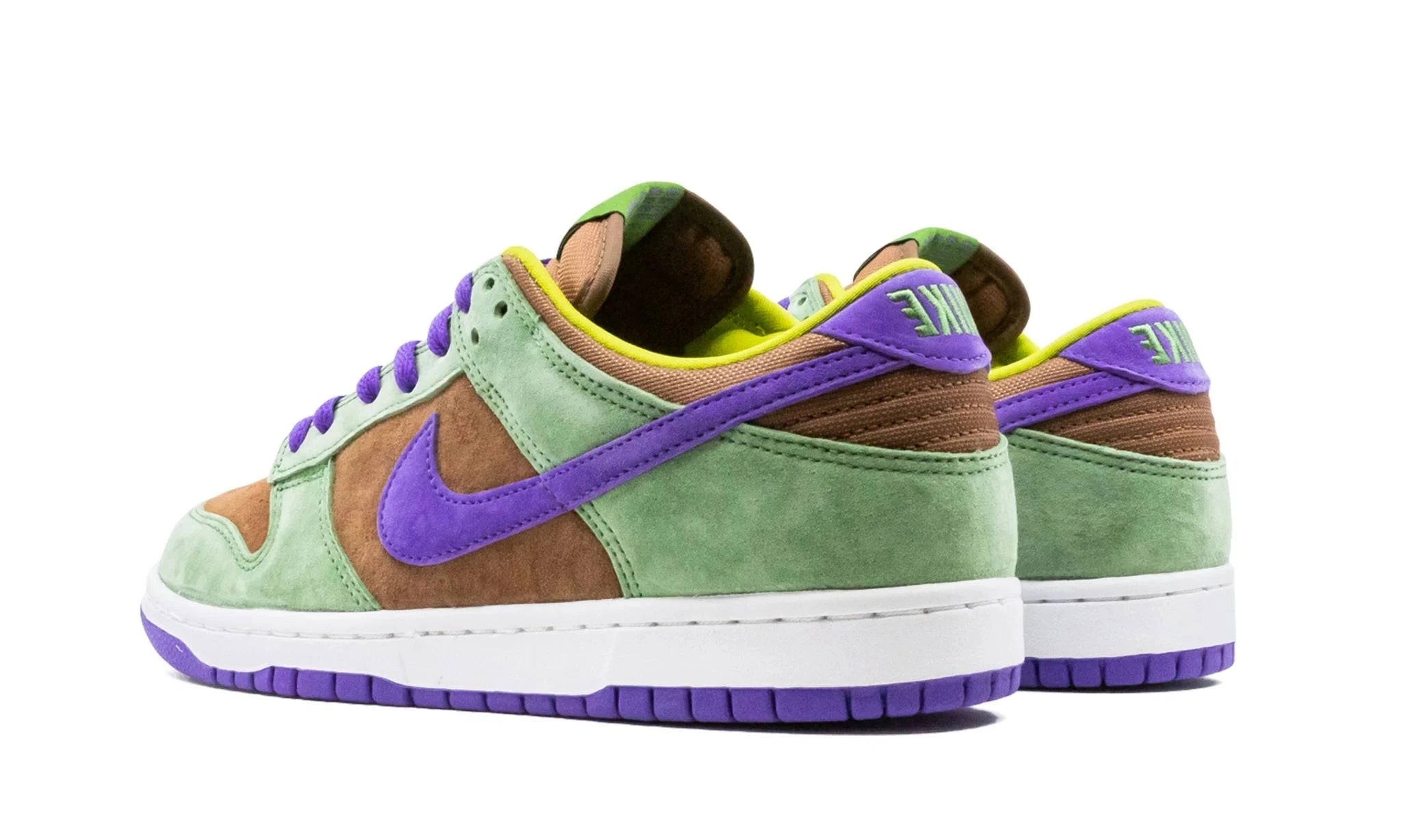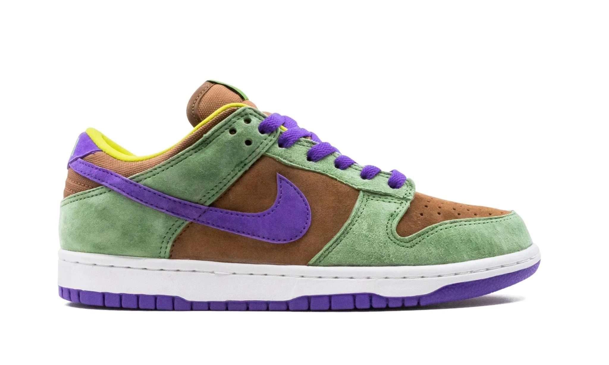 The Nike Dunk Low SP "Veneer" is a vibrant and eye-catching sneaker that combines bold colors with premium materials. The upper is crafted from a mix of soft suede, featuring a combination of green, brown, and purple hues. The green suede covers the toe box, side panels, and collar, while the brown overlays add a natural, earthy contrast. Purple accents on the Swoosh, laces, and heel tab provide a pop of color, creating a striking and dynamic look. A white midsole offers a clean contrast, and the green outsole ties the design together. The cushioned insole and padded collar ensure comfort and support for everyday wear.