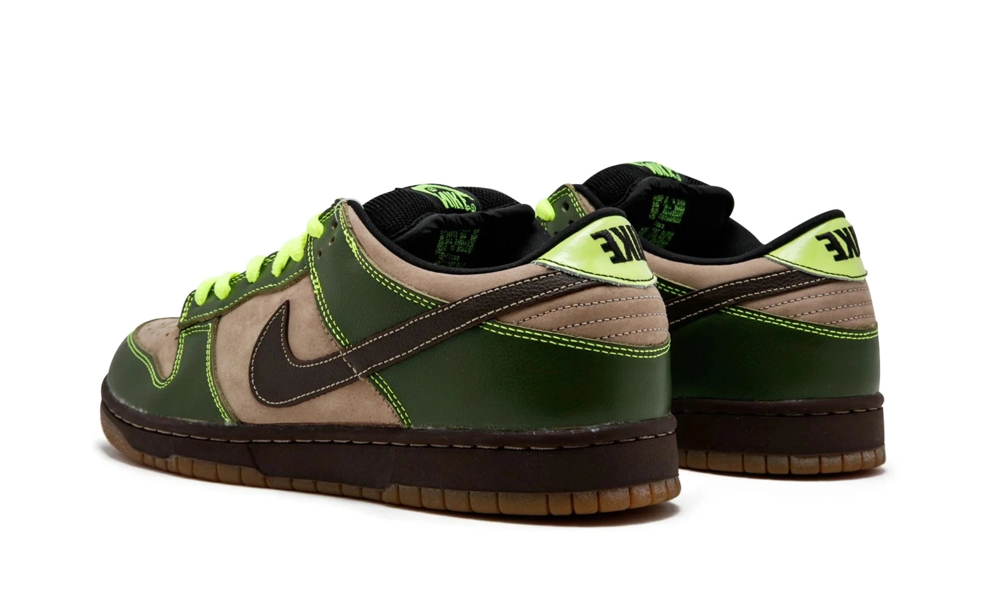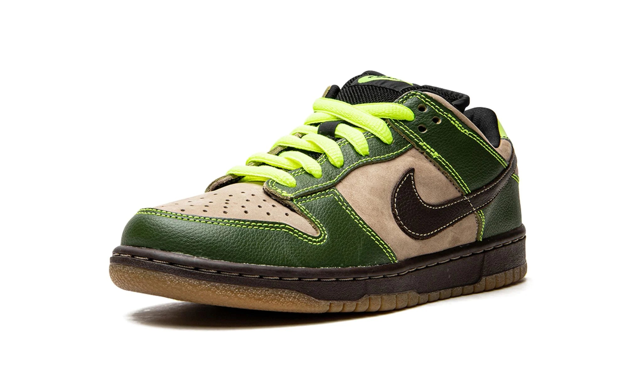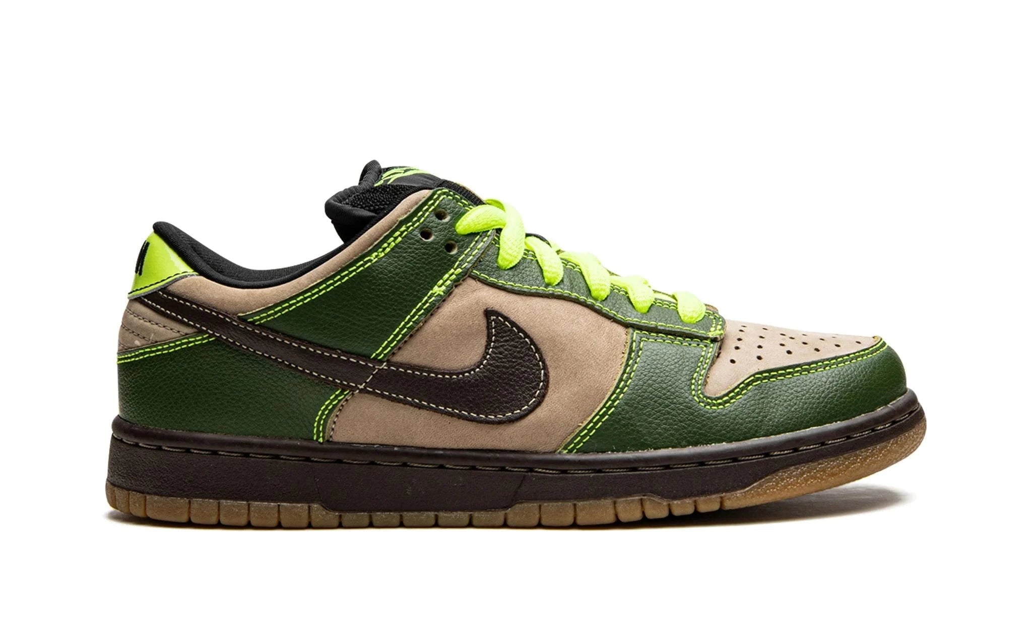 - Classic Dunk Silhouette: Staying true to its roots, the Dunk Low Pro SB features a classic silhouette with a perforated toe box for breathability and a padded collar for enhanced comfort. The prominent Swoosh logo in black stands out against the olive backdrop, reinforcing the sneaker's heritage.