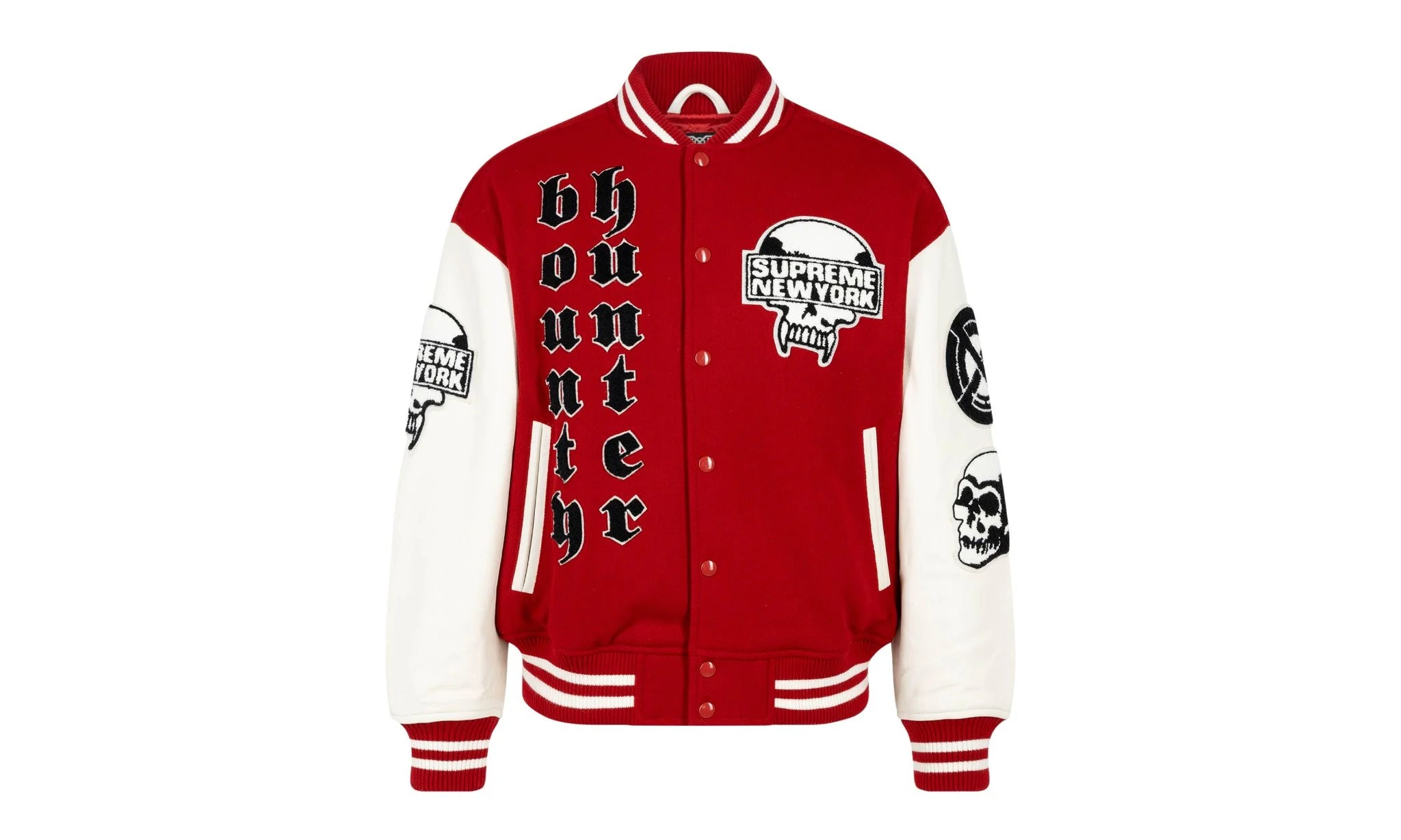The Supreme Bounty Hunter Varsity Jacket "Red" is a must-have for streetwear enthusiasts. Its combination of classic varsity style, bold color, and unique embellishments make it a standout piece for any wardrobe. Whether you're looking to make a fashion statement or simply want to stay comfortable, this jacket is designed to deliver style and functionality in equal measure.