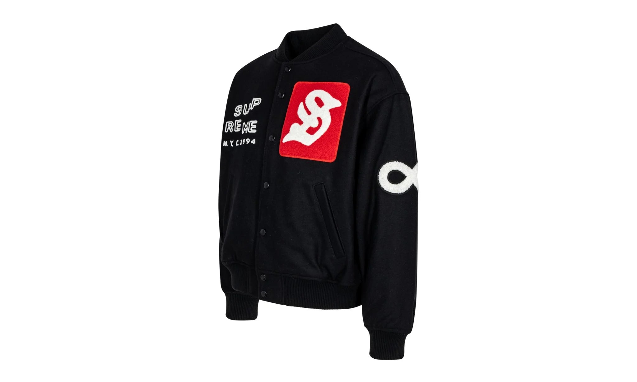 • The jacket comes in a black base color, offering a sleek and versatile look that pairs well with various outfits. Supreme’s choice of materials typically includes a blend of wool for the body and leather or faux leather for the sleeves, creating a classic varsity feel while ensuring warmth and durability.